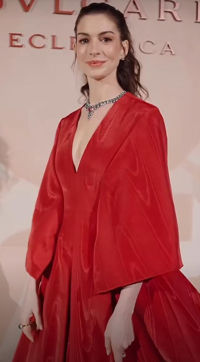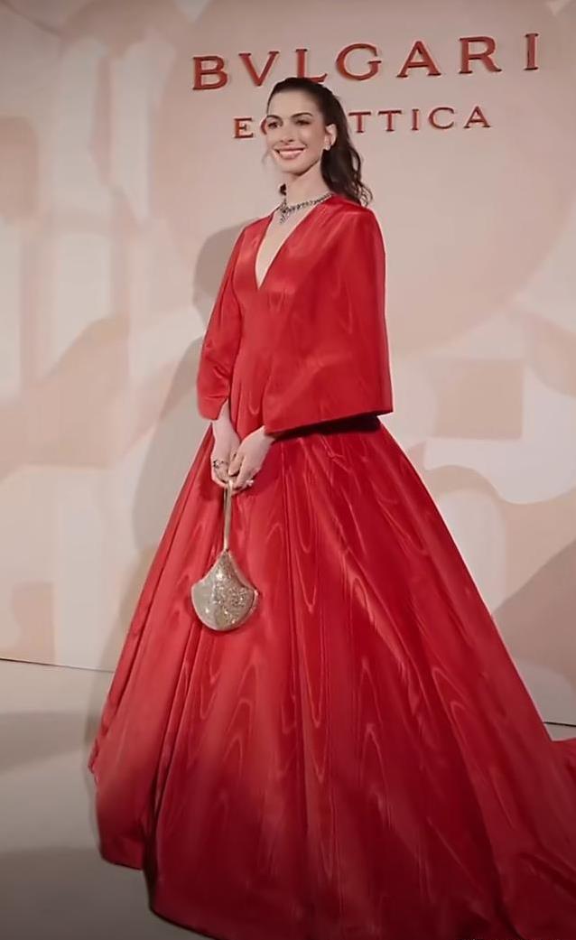 安妮海瑟薇选择了一条深红色长裙。裙子剪裁简洁,宽大的裙摆和衣袖让她整个人显得很有气场。红色面料在灯光照射下闪烁着细微的光泽,并不显得单调。她扎起高马尾,发尾轻甩时,整个人看起来精神饱满,气色极佳。